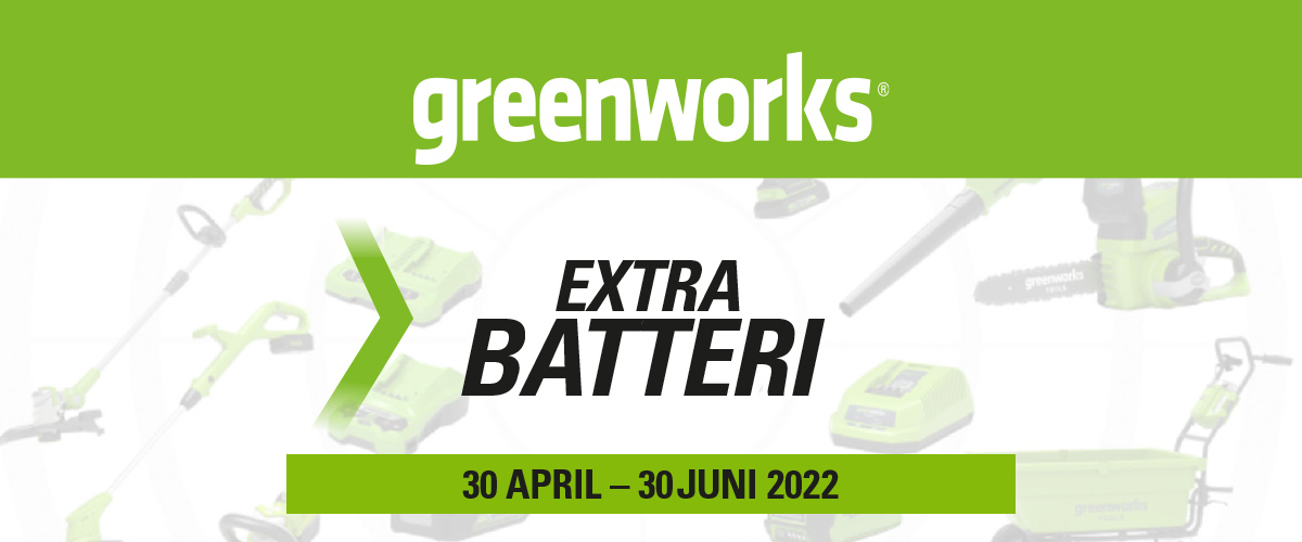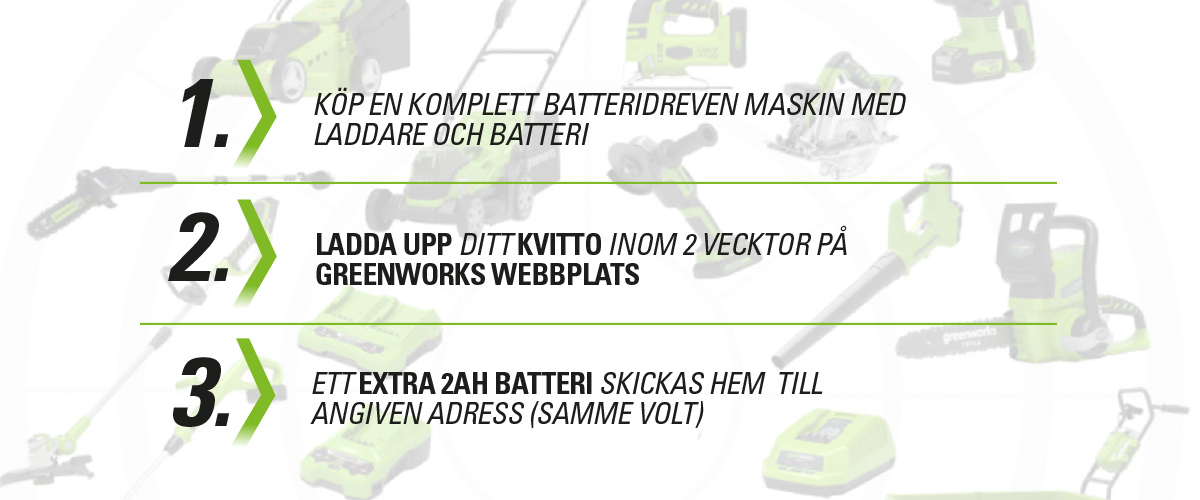 I maj och juni kör vi en kampanj i samarbete med Greenworks där du kan få ett extra 2Ah batteri i den Volt-grupp du har handlat i, om du köper en komplett batteridriven maskin (elverktyg eller trädgårdsredskap) med batteri och laddare.
